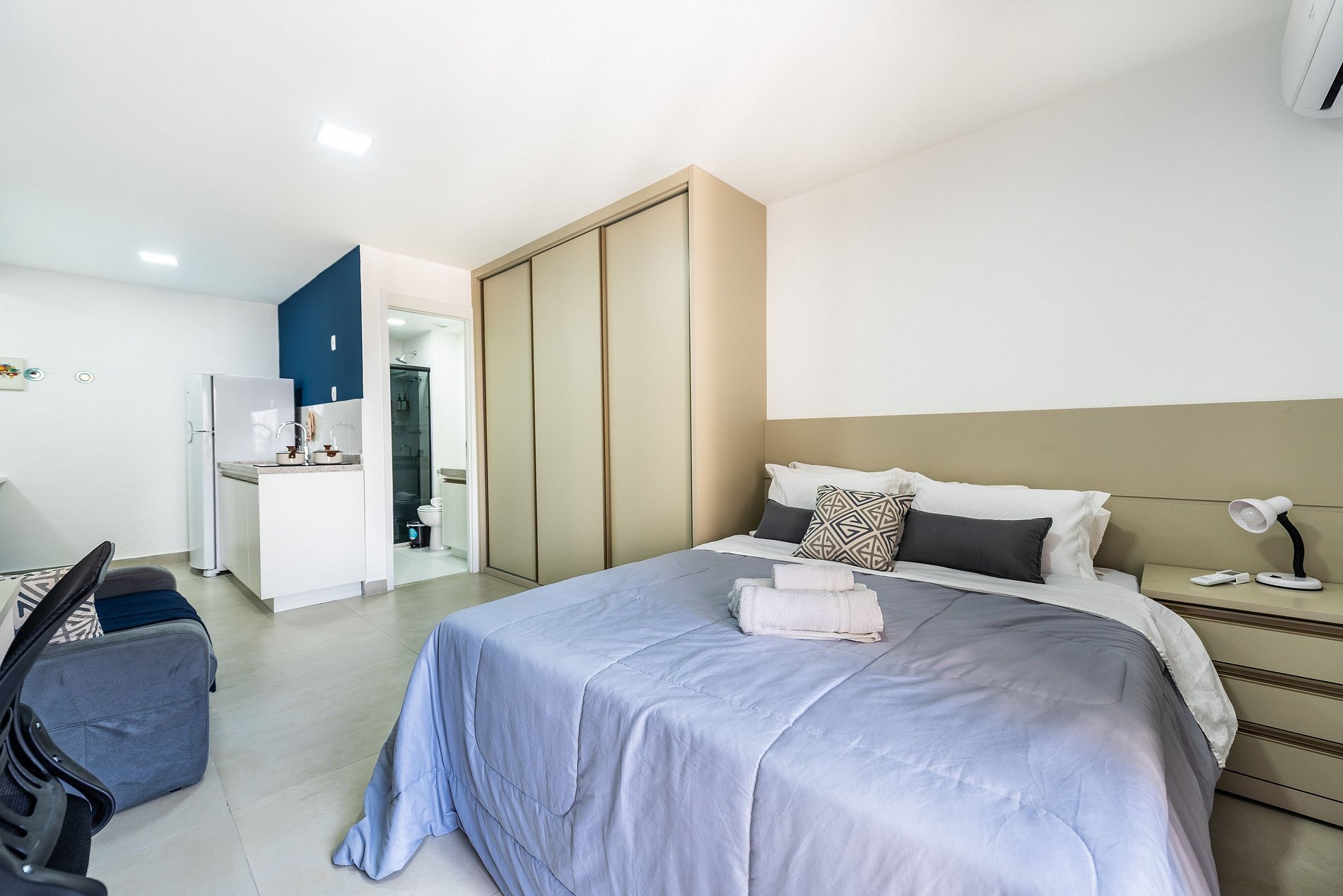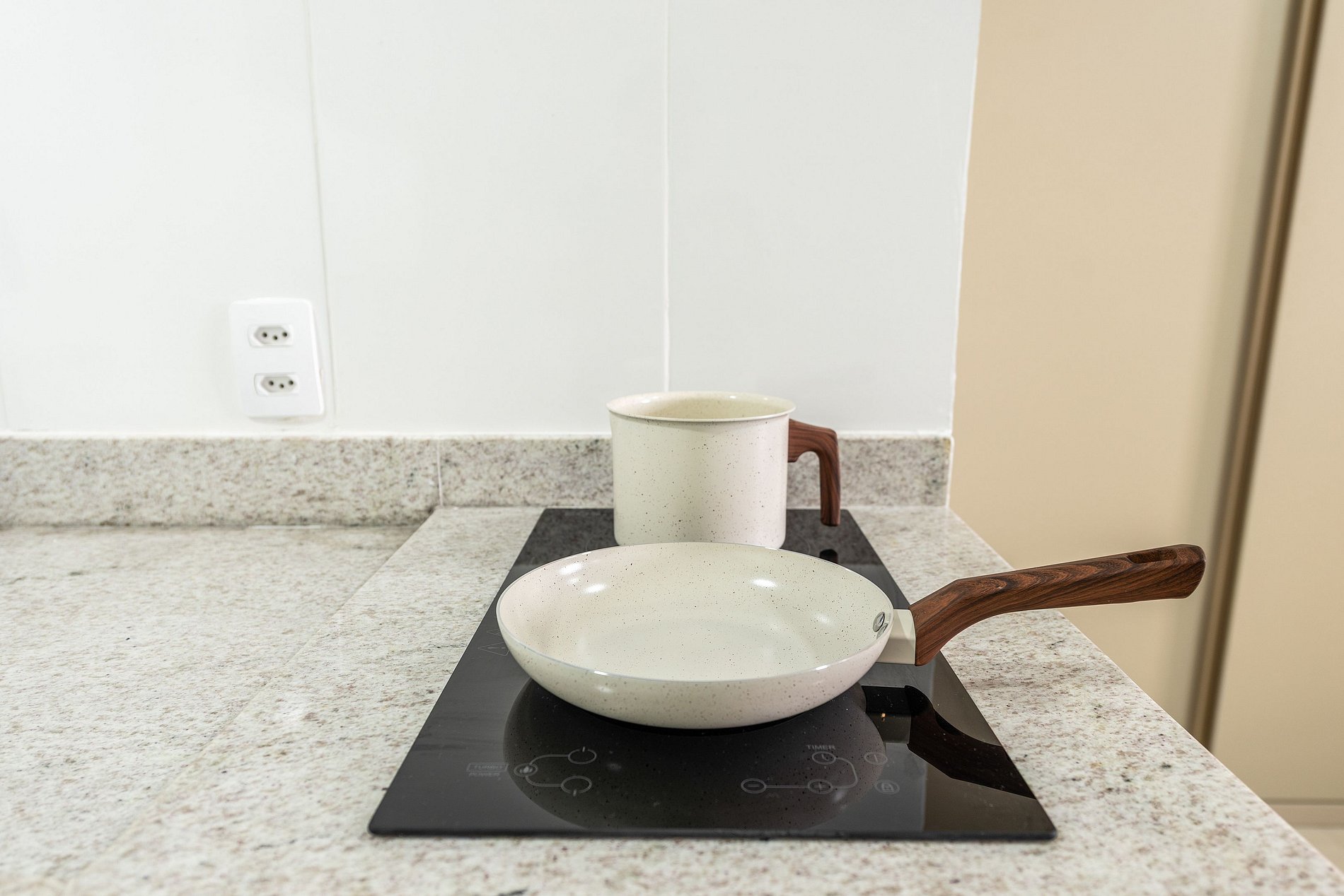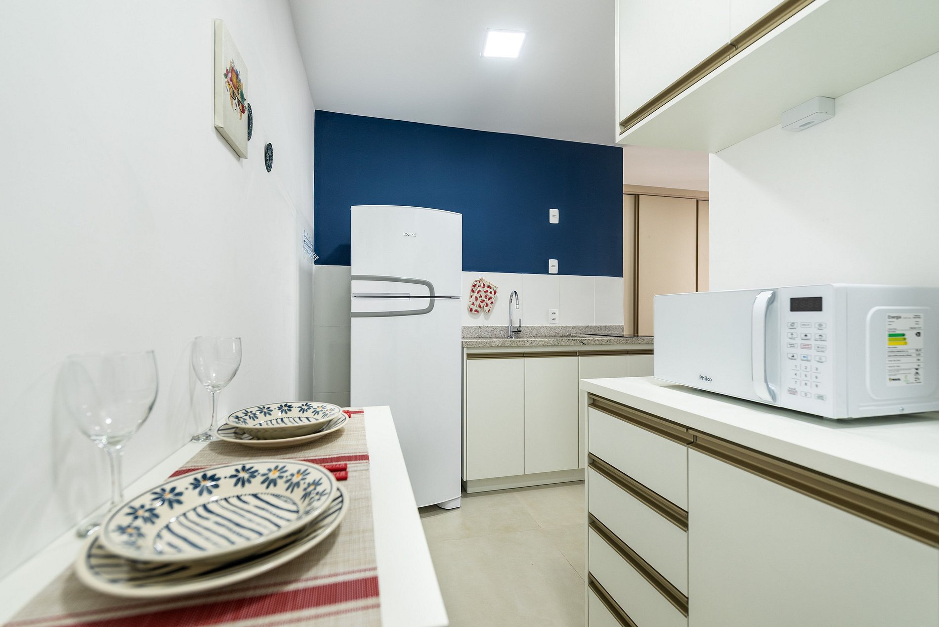 - Cozinha americana com fogão de indução 2 bocas, micro-ondas, sanduicheira, cafeteira elétrica, liquidificador e chaleira elétrica.