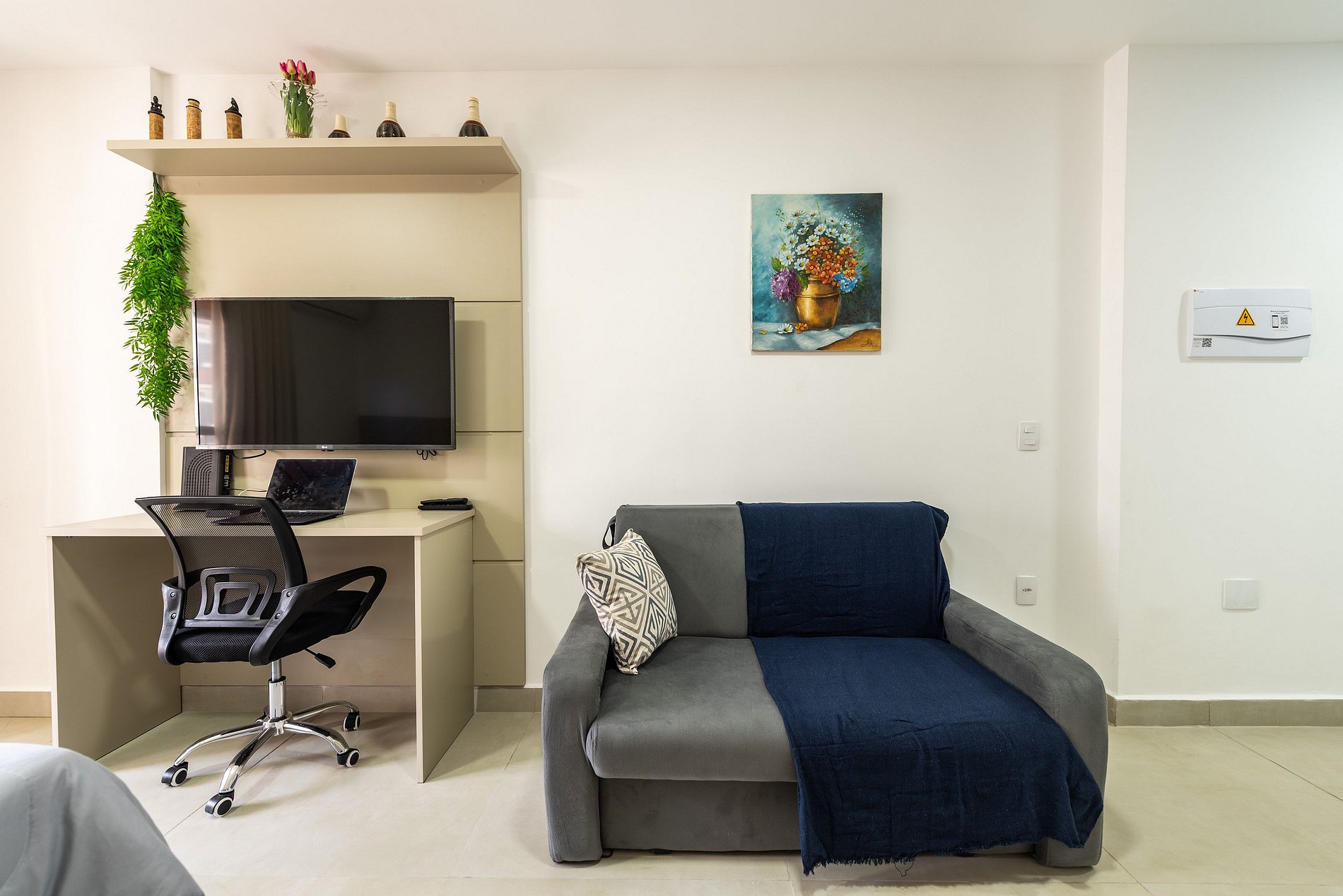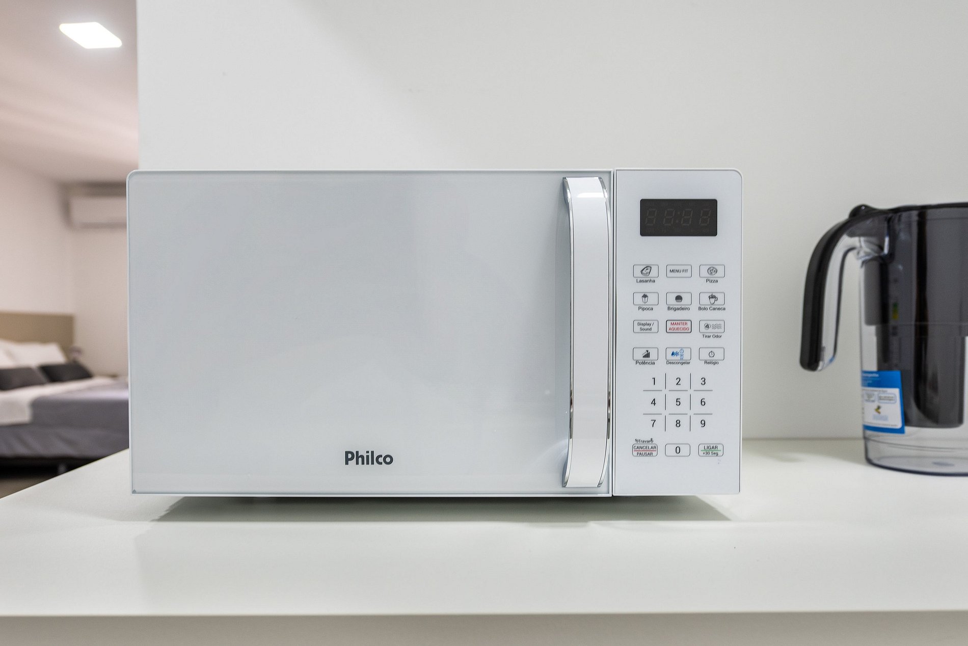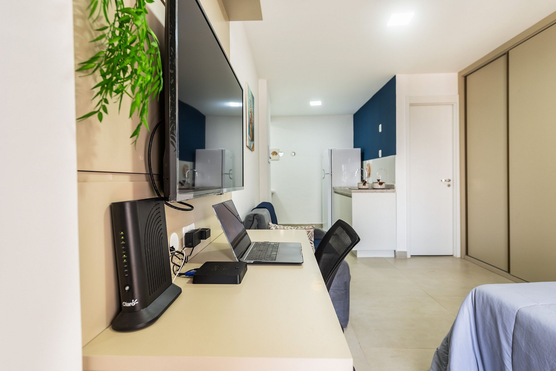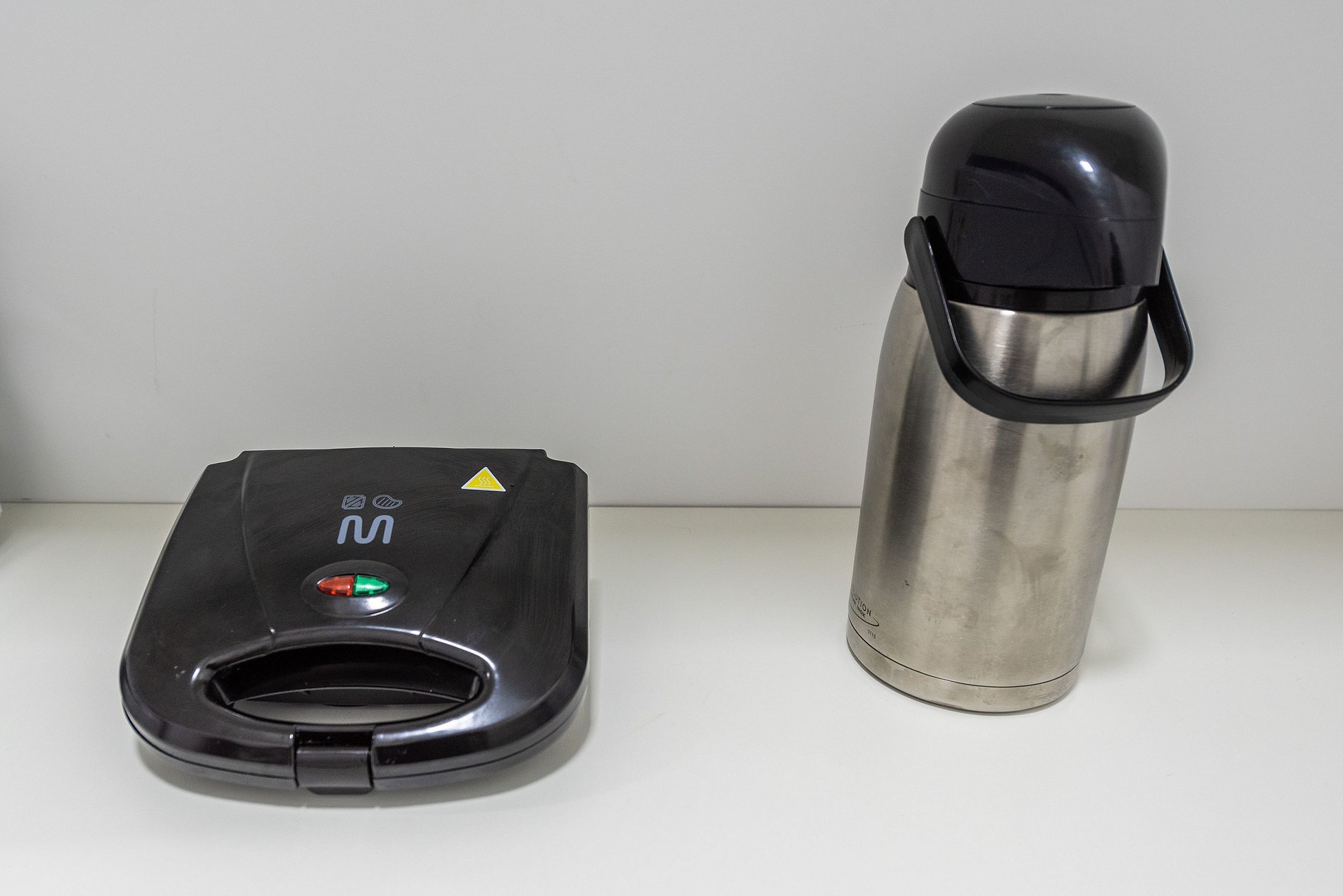 - Cozinha americana com fogão de indução 2 bocas, micro-ondas, sanduicheira, cafeteira elétrica, liquidificador e chaleira elétrica.