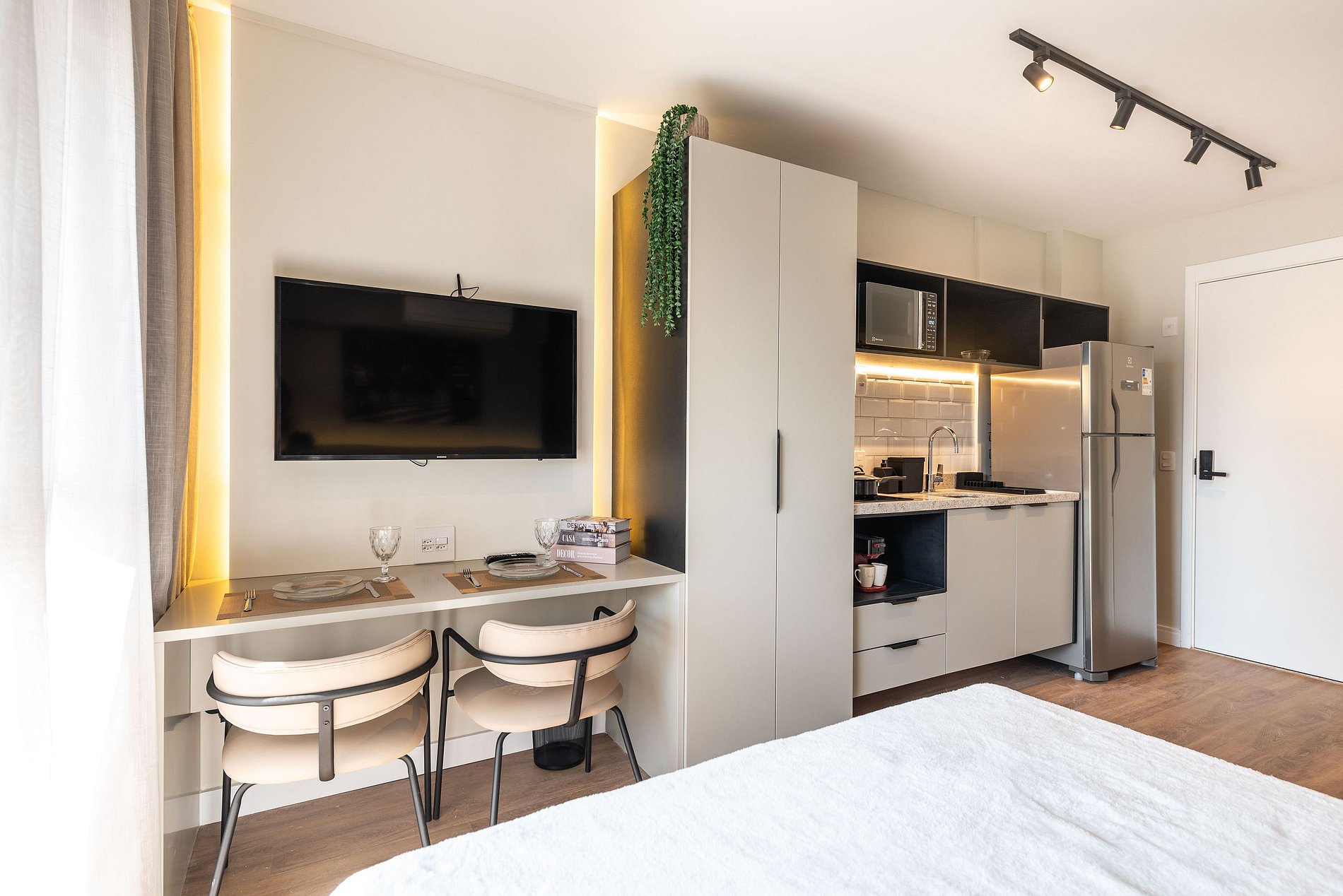 - Cozinha americana com fogão de indução 2 bocas, micro-ondas, cafeteira elétrica, jarra purificadora de água.