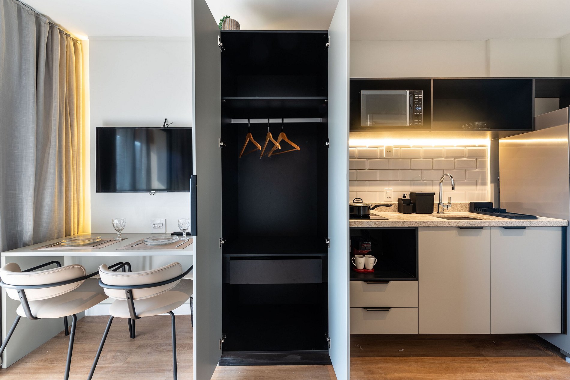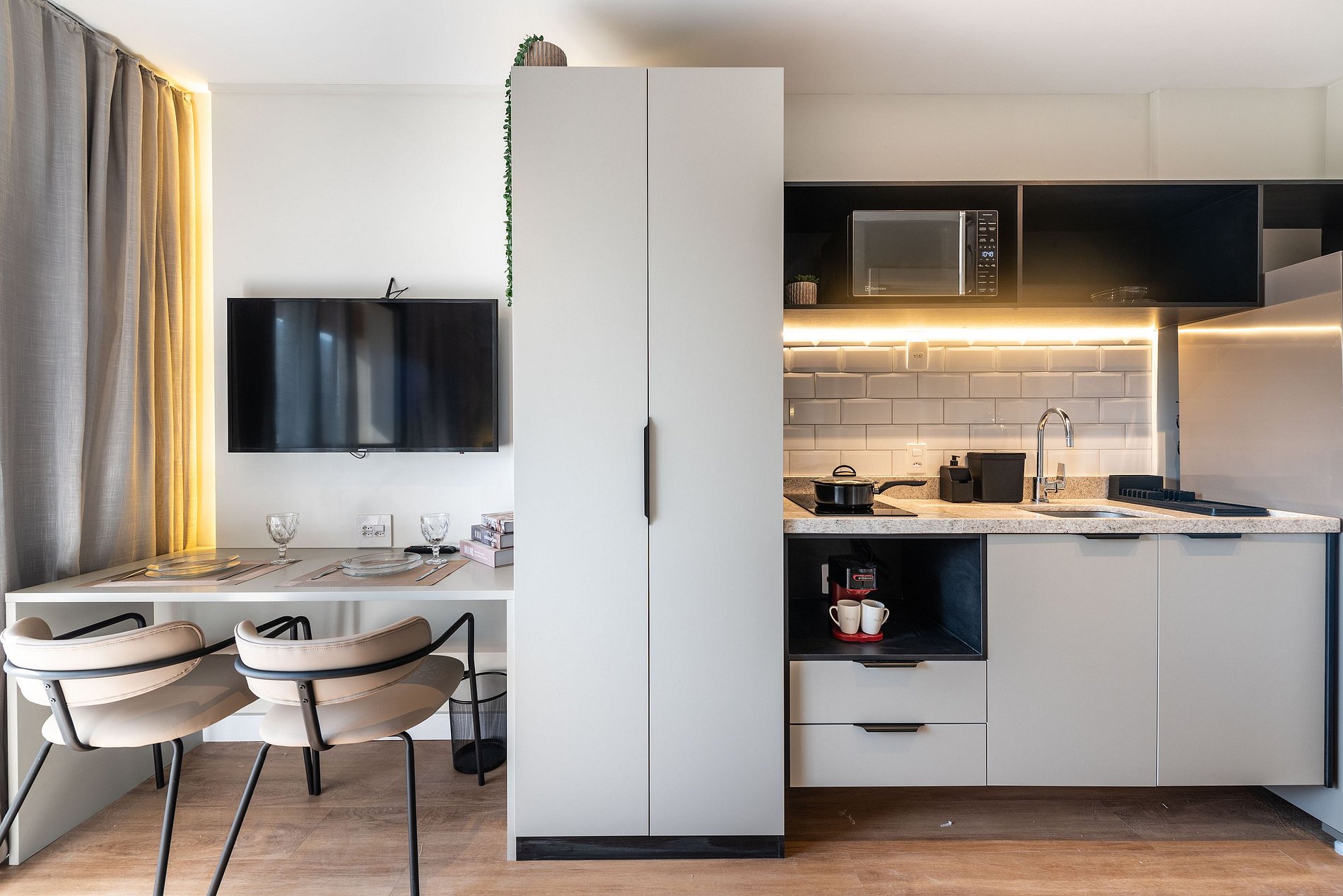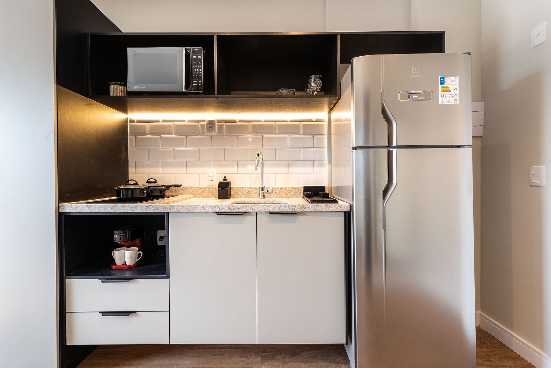 - Cozinha americana com fogão de indução 2 bocas, micro-ondas, cafeteira elétrica, jarra purificadora de água.