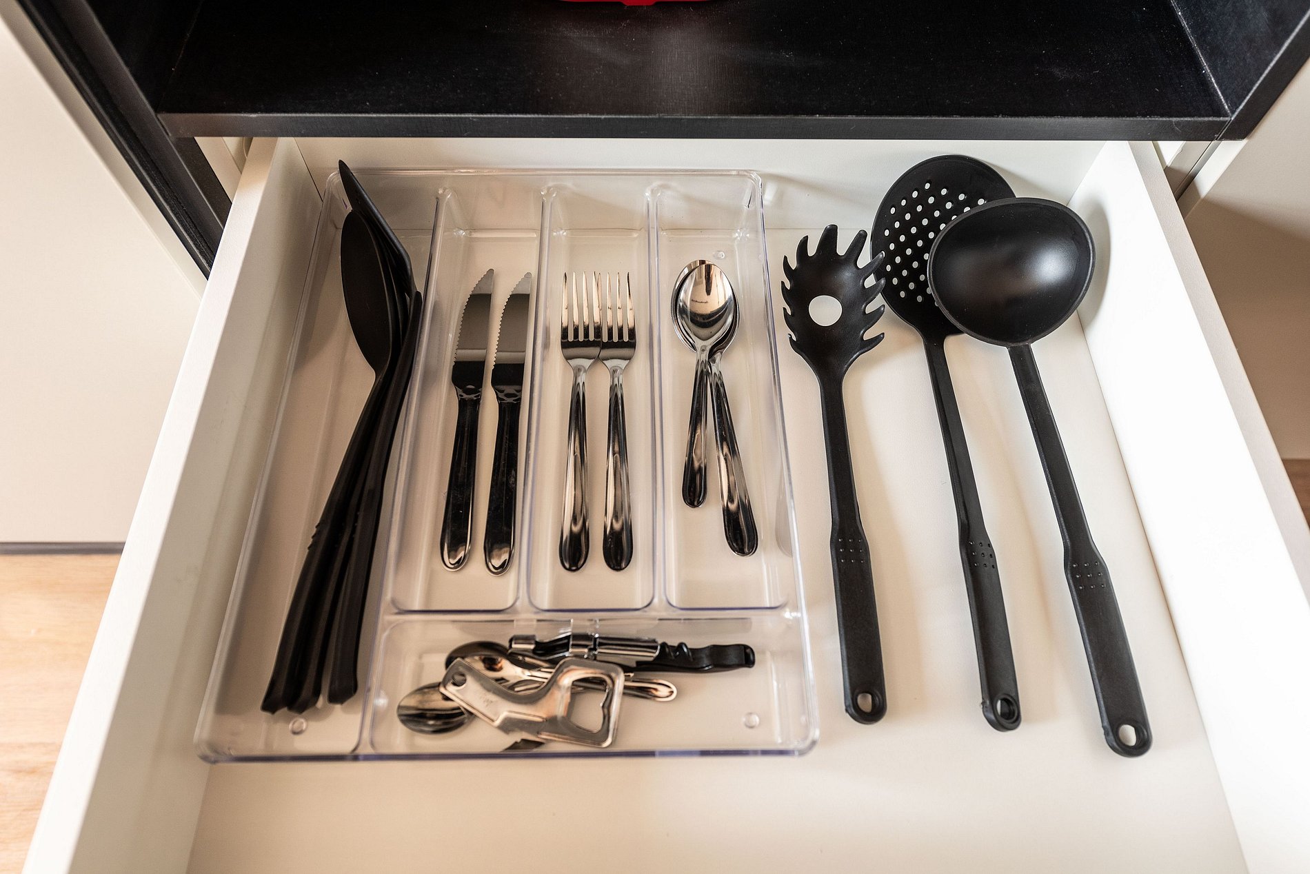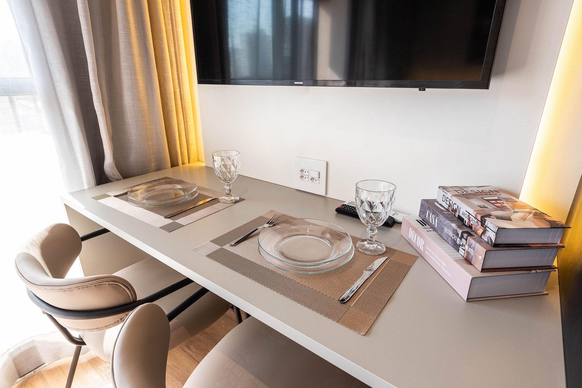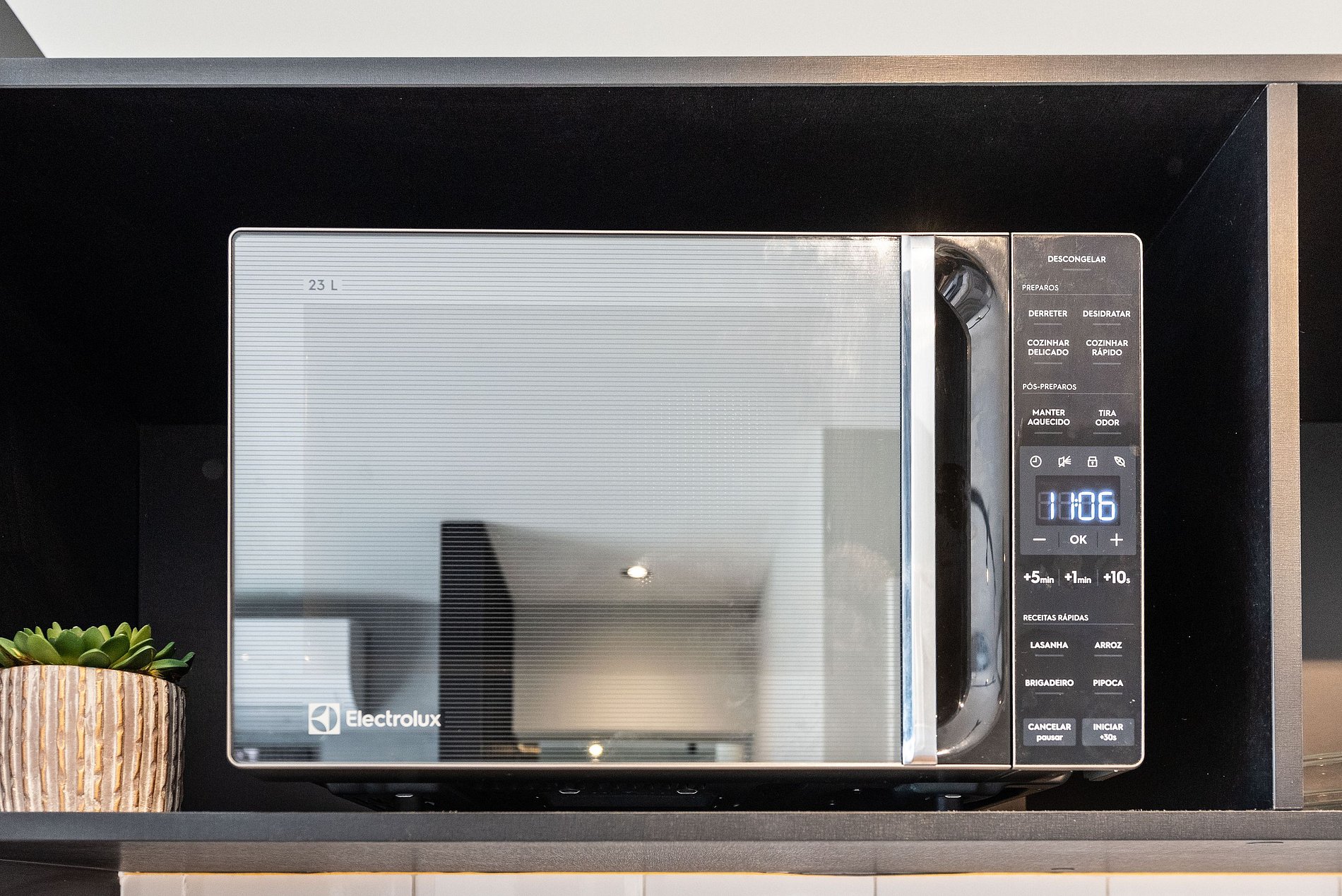 - Cozinha americana com fogão de indução 2 bocas, micro-ondas, cafeteira elétrica, jarra purificadora de água.