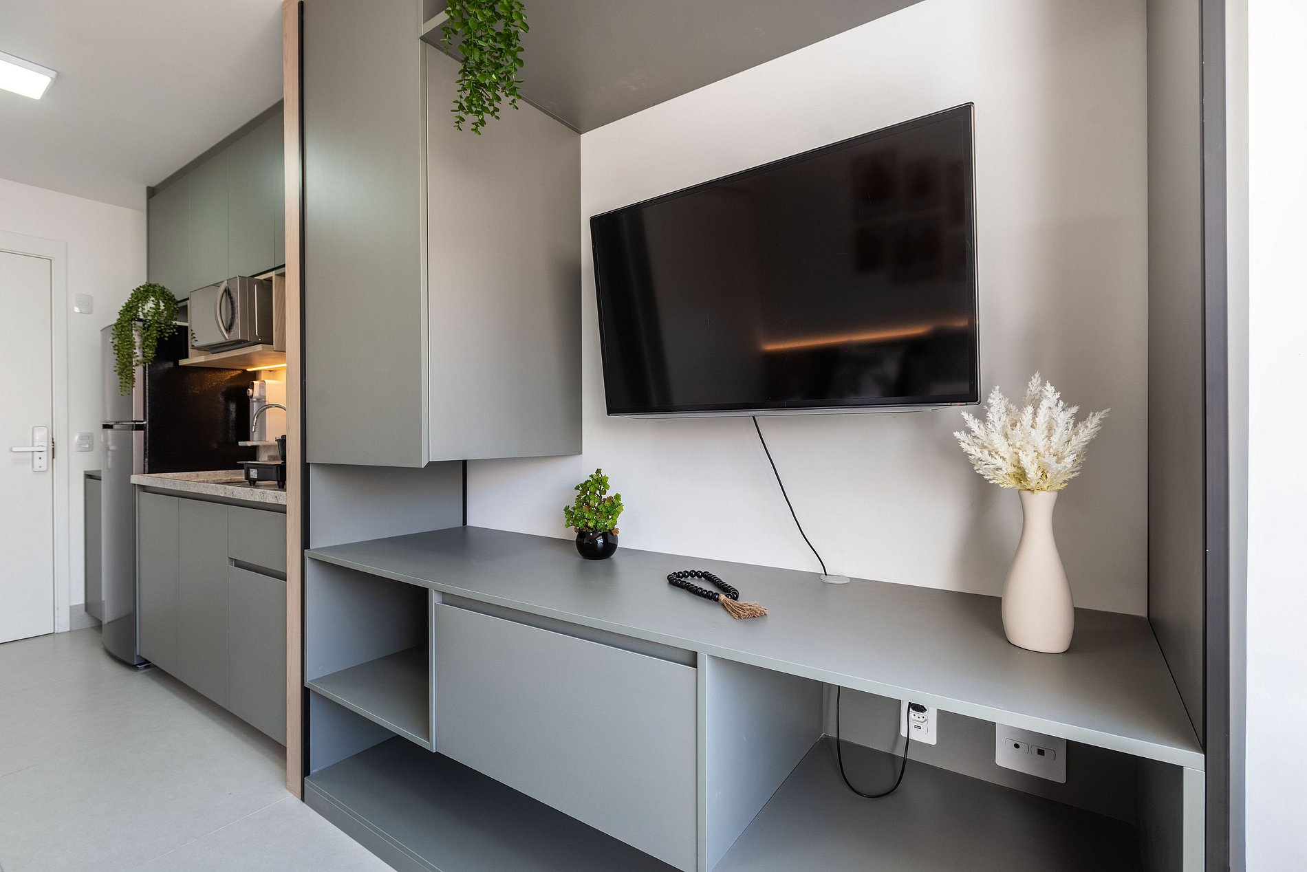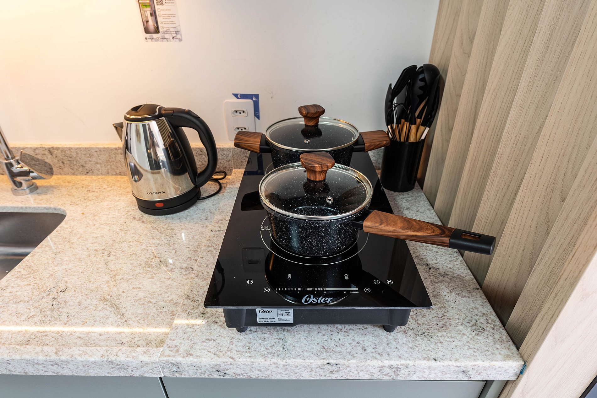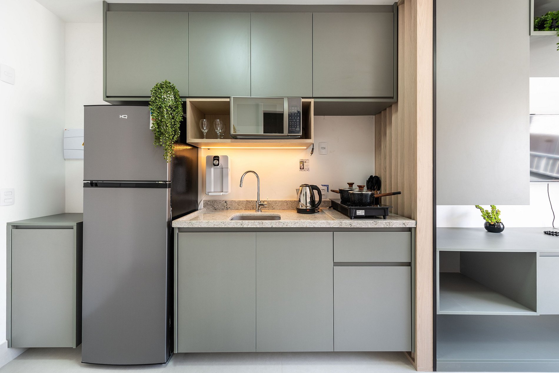 - Cozinha americana com fogão de indução 2 bocas, micro-ondas, chaleira elétrica e liquidificador etc.