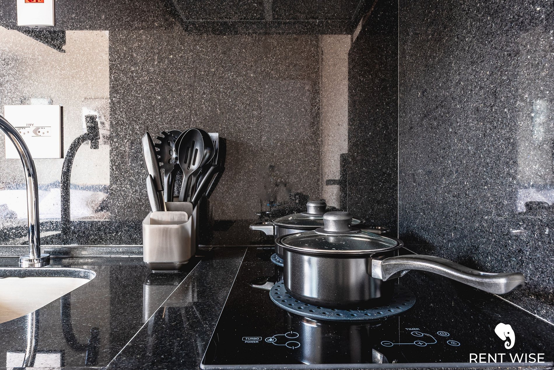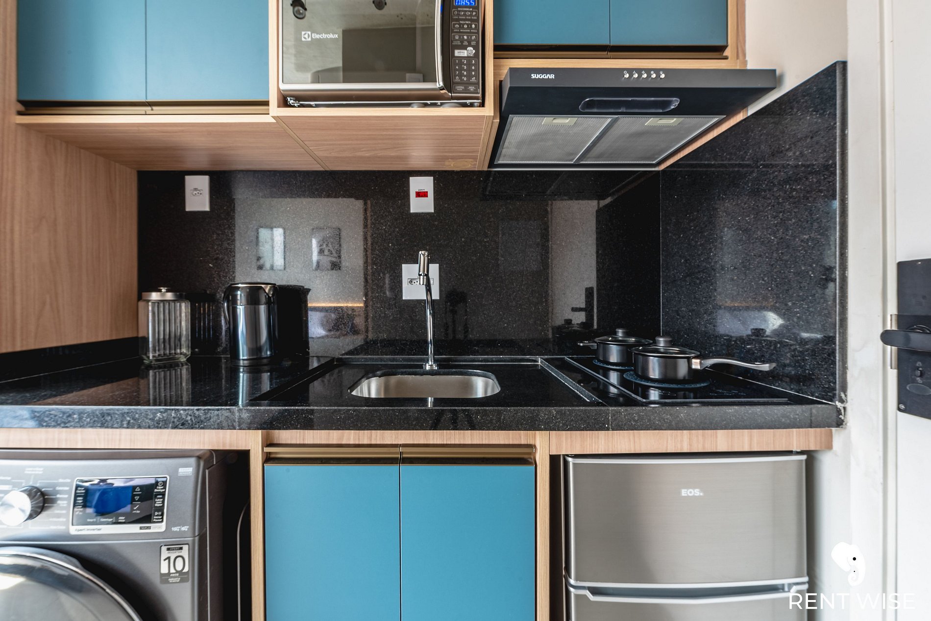- Cozinha americana com fogão de indução 2 bocas, micro-ondas, cafeteira elétrica, jarra purificadora de água.